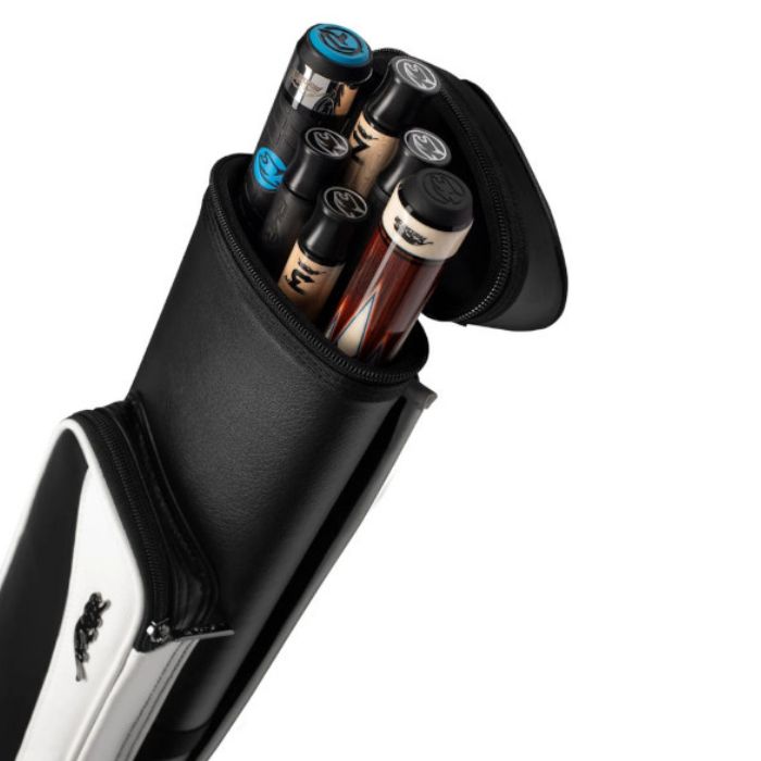ジャンプキューのバットとエクステンションを収納できる外ポケット、着脱可能なパッド付きストラップ。耐久性抜群の合成皮革とダブルステッチ構造からなり、様々な状況下で使用できるこのケースは、どんなゲームの舞台であれ出発の準備ができている。