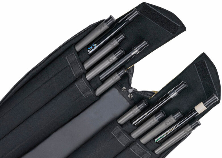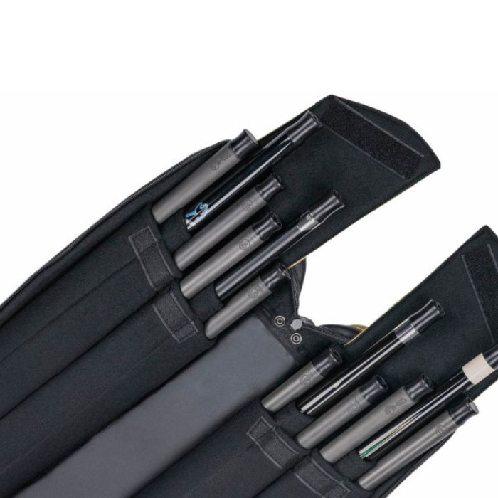 ジャンプキューのバットとエクステンションを収納できる外ポケット、着脱可能なパッド付きストラップ。耐久性抜群の合成皮革とダブルステッチ構造からなり、様々な状況下で使用できるこのケースは、どんなゲームの舞台であれ出発の準備ができている。