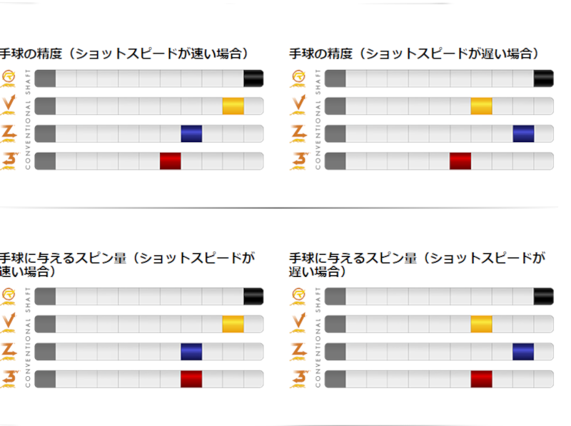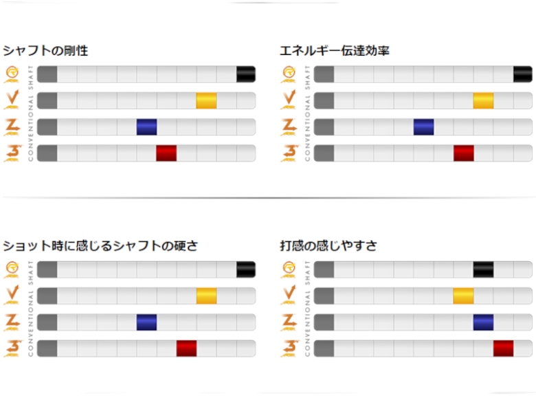 自分に適したシャフトを選ぶことは、ときに非常に複雑で頭を悩ませる作業である。カーボンファイバーからなるREVOシャフト、分割貼り合せ構造のVantageシャフト、314シャフト、Zシャフトは、それぞれに異なるアドバンテージを持つため、プレイヤーは自身のストロークやプレイスタイルに合ったシャフトを選択することが可能となる。