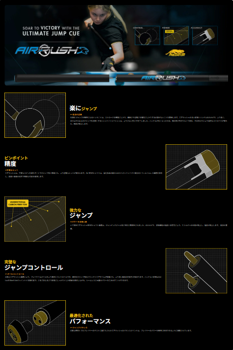 Air Rush テクノロジーの背後にある生の運動エネルギーを利用して、市場で入手可能な最高のジャンプ キュー パフォーマンスを実現し、立ちはだかる障害物を飛び越えましょう。当社の Air REVO カーボンファイバー ジャンプ シャフトは、パワーとコントロールの簡単な伝達を実現します。すでに難しいショットの成功率を高め、トリッキーな状況でテーブルにより多くのオプションを追加するために設計および開発されました。
